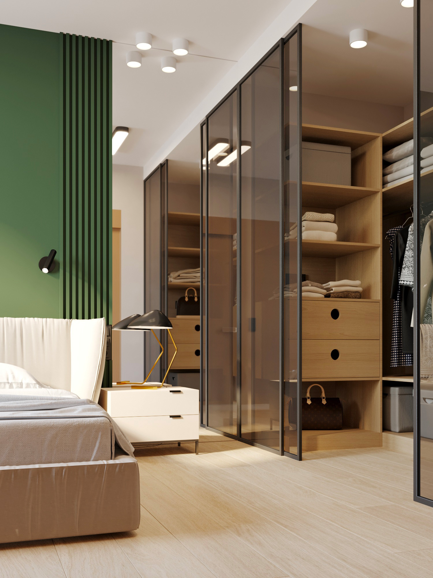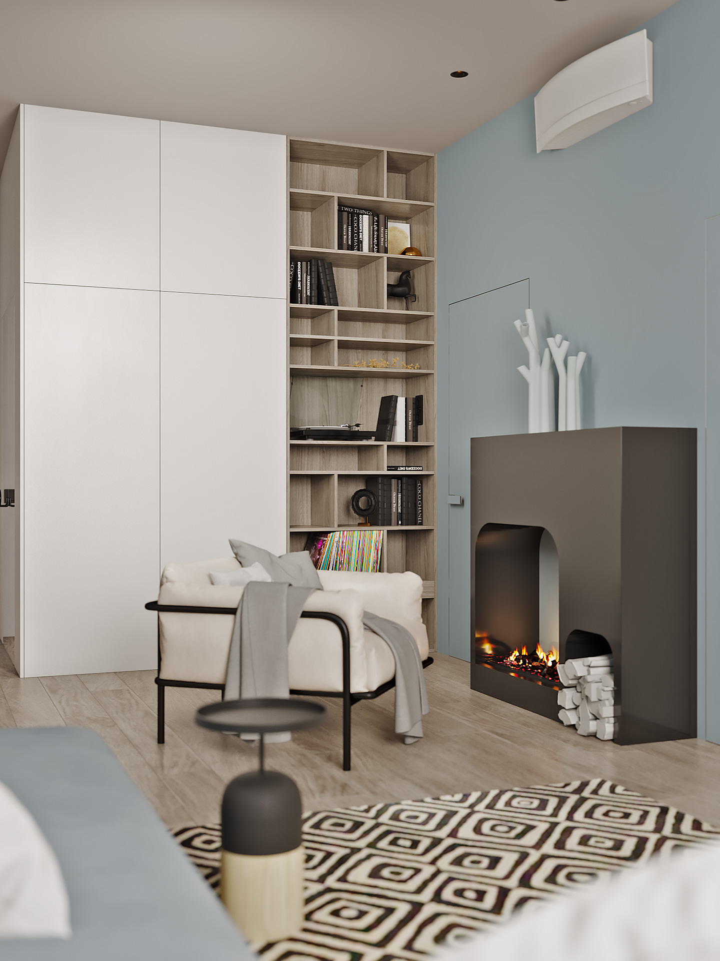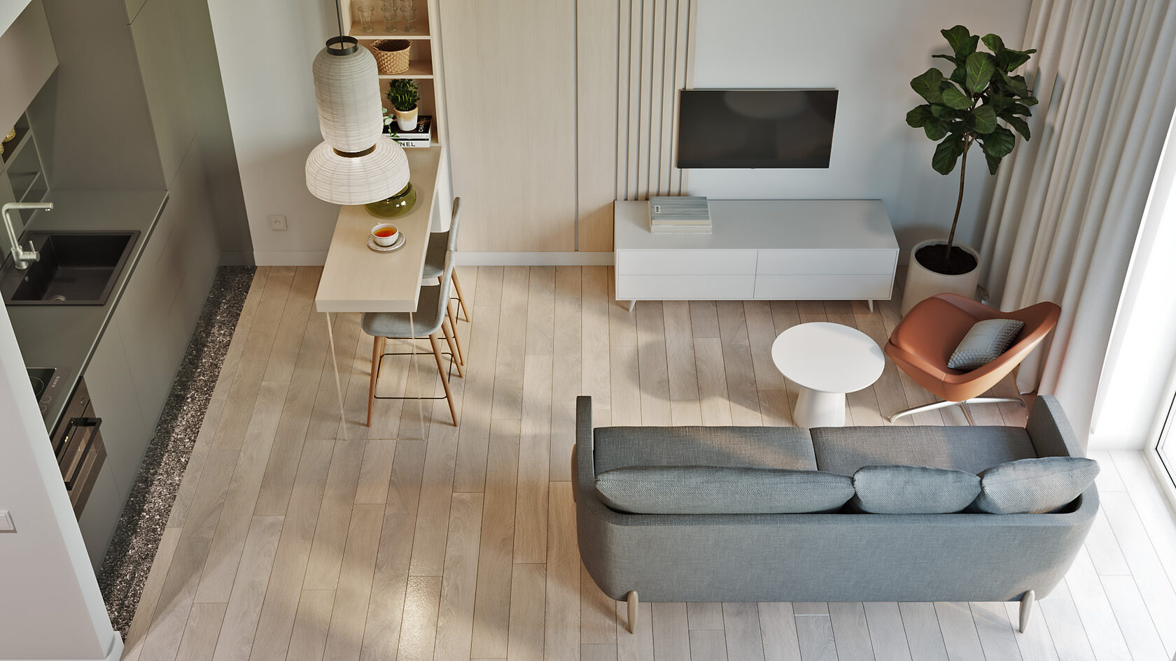 Les fenêtres panoramiques, qui s'étendent du sol au plafond, renforcent la luminosité naturelle et agrandissent visuellement l’intérieur. Enfin, les différentes zones ont été soulignées à l’aide de matériaux, textures et couleurs distinctes, une idée efficace pour aménager un petit appartement sans cloisonner.