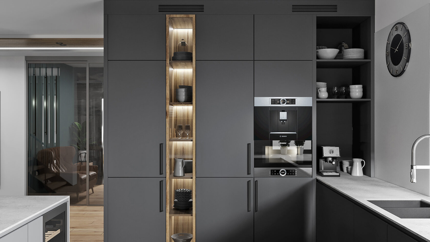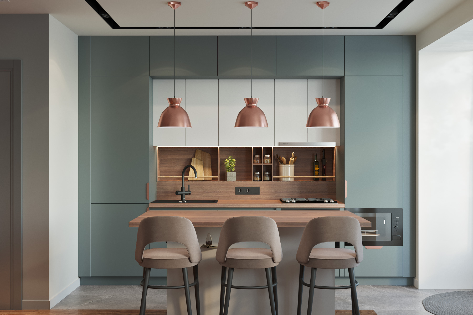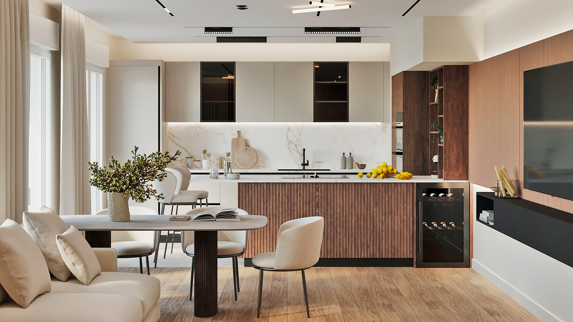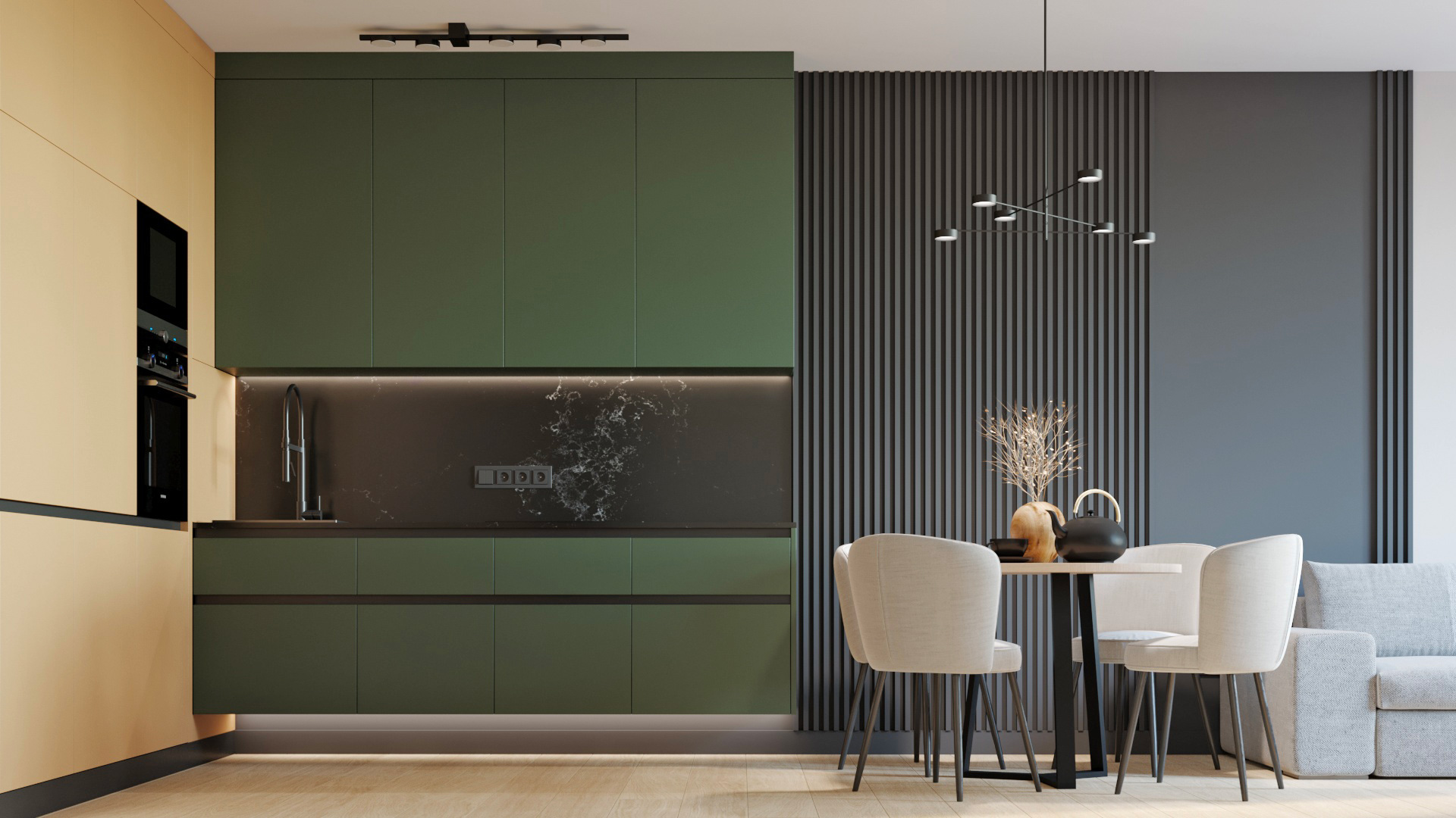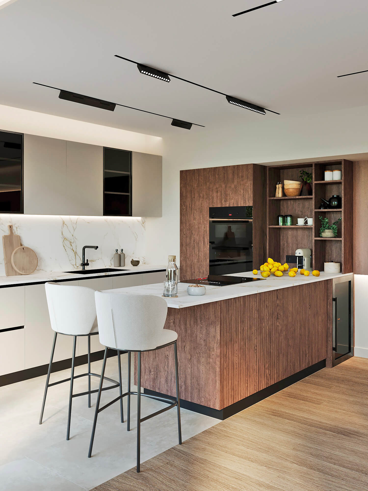 Dans cet appartement compact, la cuisine a été pensée avec des rangements suspendus qui créent un effet de légèreté. Le bois clair des colonnes apporte chaleur et accueille l’électroménager, tandis que les éléments sombres équilibrent l’ensemble sans alourdir la pièce. L’éclairage sous les meubles renforce l’impression aérienne : une idée d’aménagement de cuisine astucieuse et élégante pour petit espace.