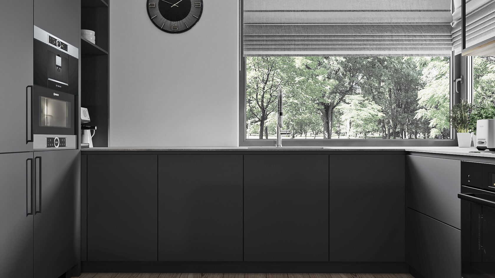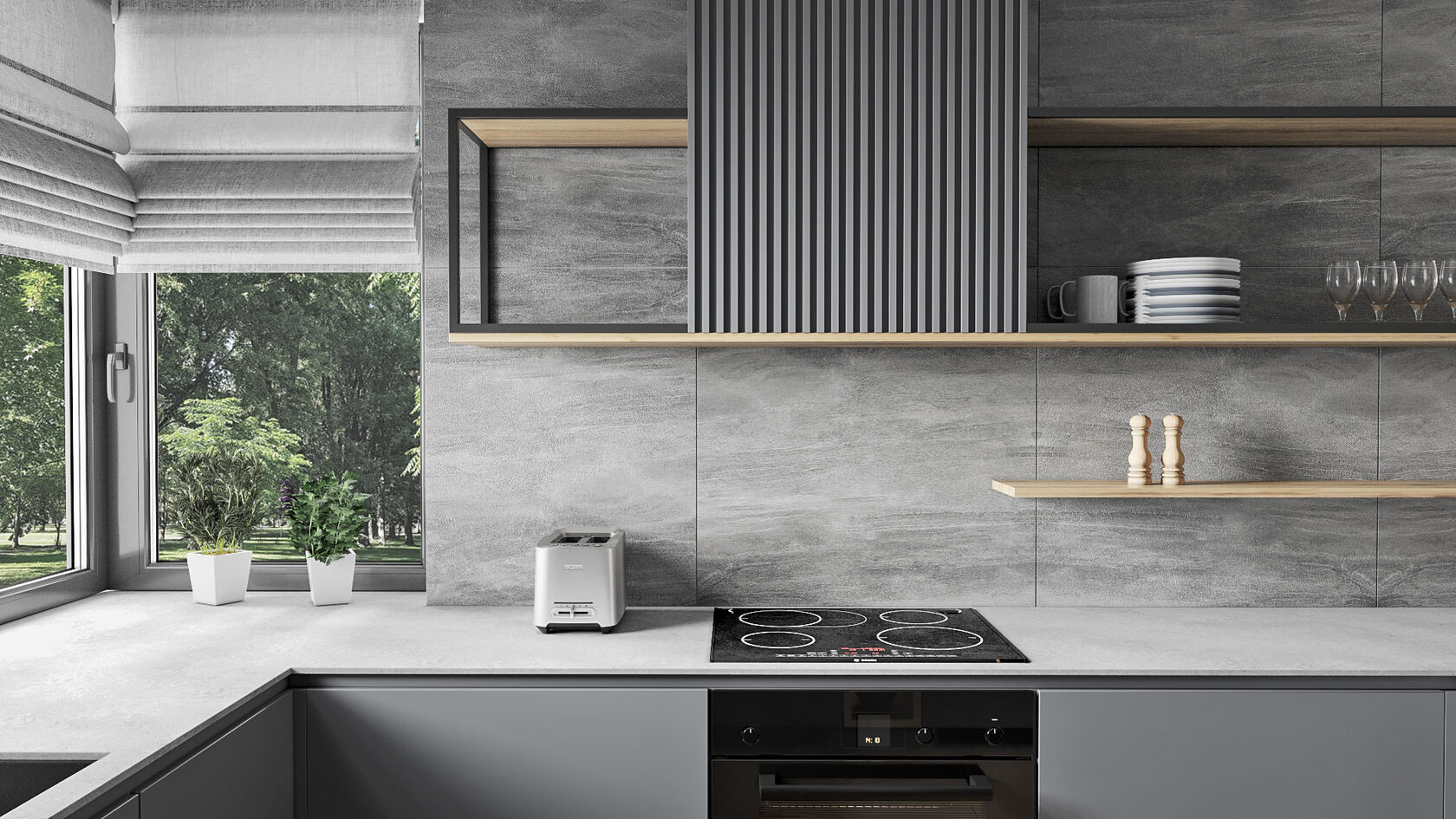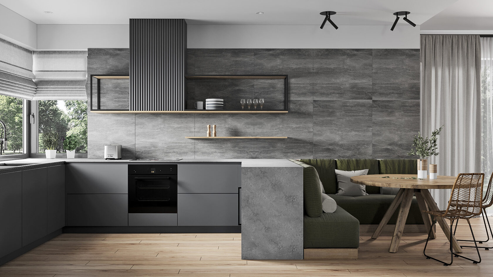 Nous avons choisi de ne pas économiser sur un mètre carré de carrelage, et le résultat est une paroi à la fois fonctionnelle et esthétique. Observez aussi le plan de travail : il se plie comme un serpent et descend vers le sol, transformant une forme compliquée en géométrie intéressante. Si l’espace est vaste et lumineux, n’ayez pas peur des couleurs sombres : gris anthracite ou bleu profond créent un coin chaleureux et intime.
